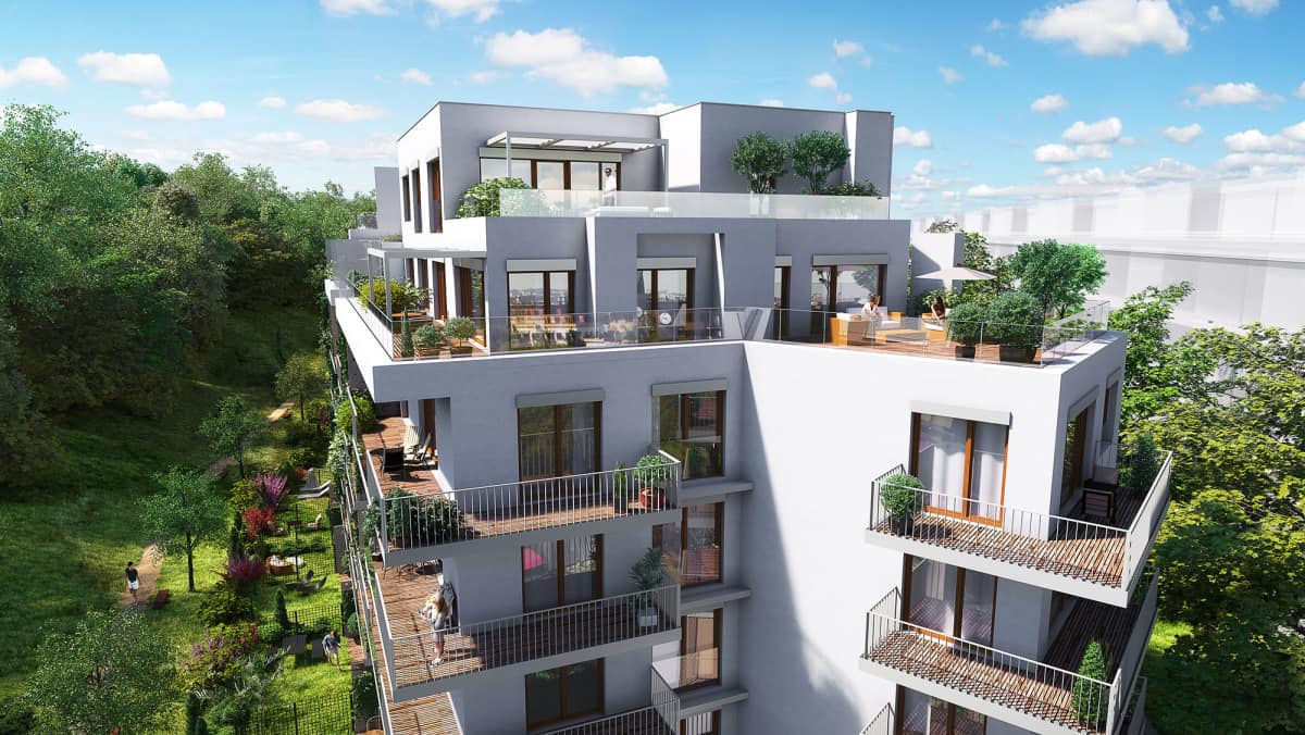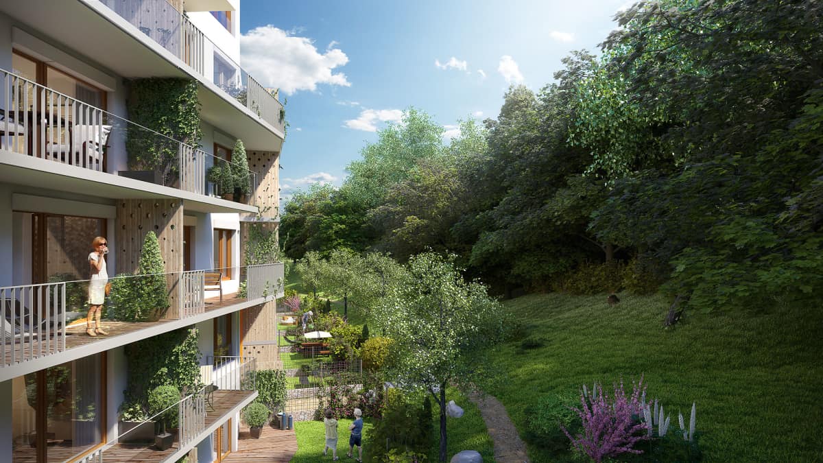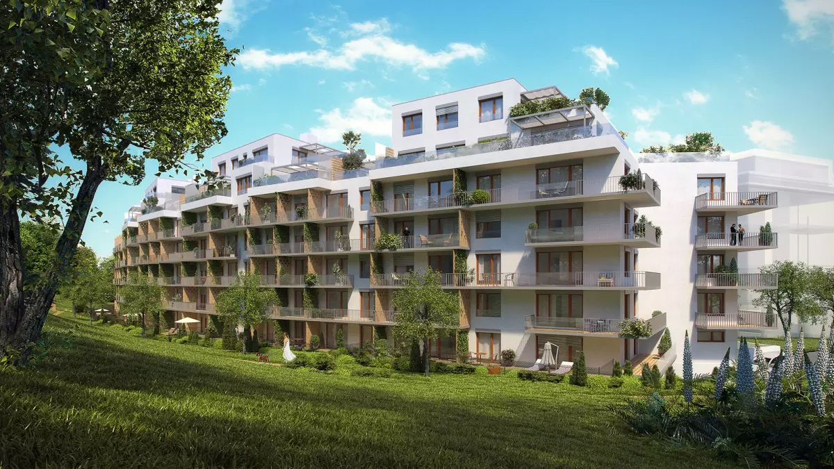V sedmi nadzemních podlažích je navrženo 250 bytů různých velikostí (od 29 m² po 156 m²), všechny byty v přízemí budovy mají vlastní předzahrádku, ve vyšších nadzemních podlažích balkón či terasu. V podzemním podlaží jsou umístěny garáže, technické zázemí a sklepní kóje. Strop nad podzemím mimo obrys nadzemních podlaží je řešen jako zelená střecha s předzahrádkami, parkovou úpravou a vodním prvkem.