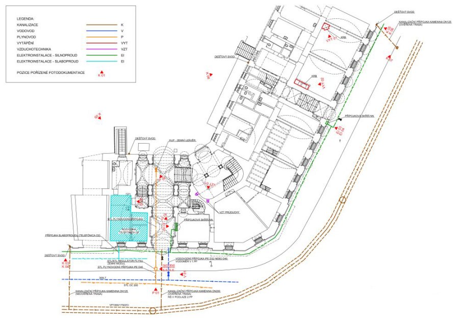 Předmětem průzkumu byly: průzkum technické infrastruktury a technického zařízení budovy, zhodnocení technického stavu budovy, dokumentace správců inženýrských sítí, revize kanalizace, revize komínových průduchu, šachet a průduchů, zmapování archívních materiálů, koncepce technické infrastruktury a technického zařízení budovy dle variant nového využití, koncepce požárně bezpečnostního řešení a odhad investičních nákladů na varianty rekonstrukce.