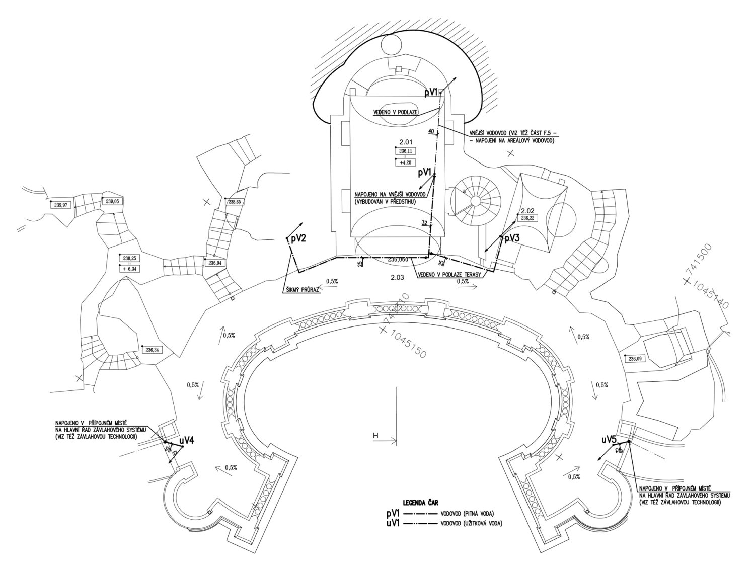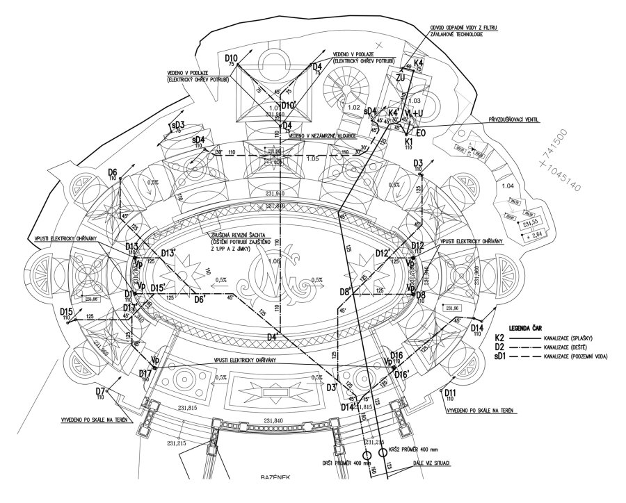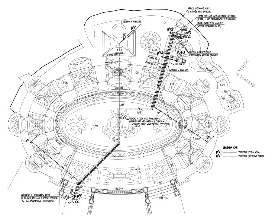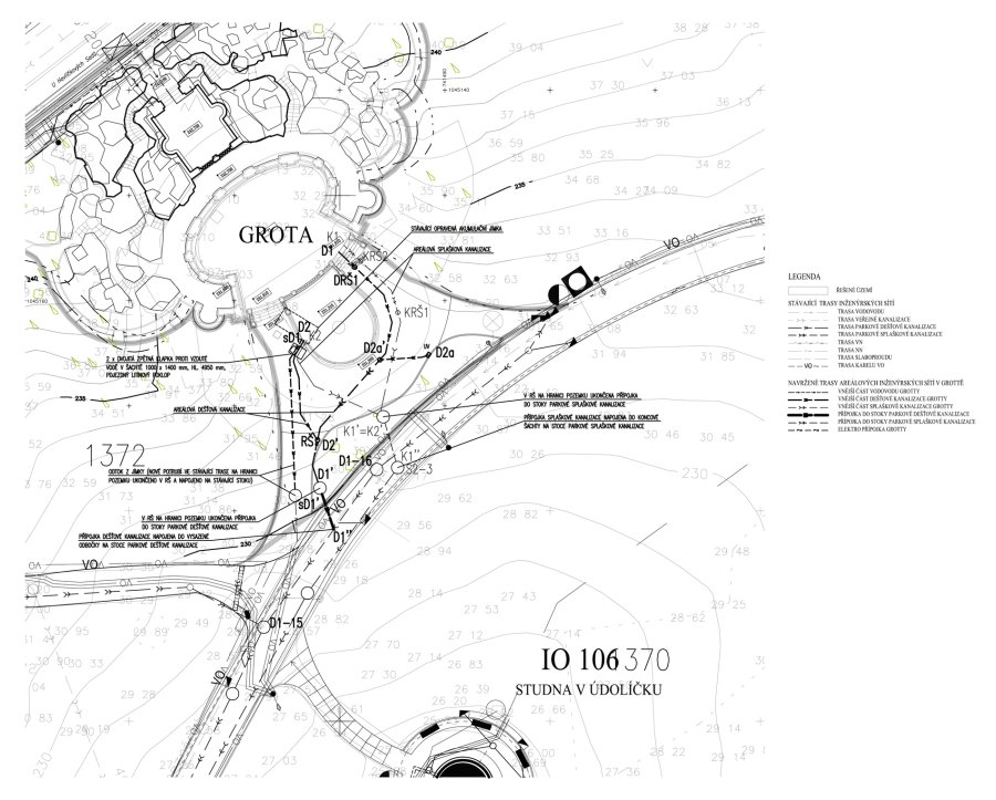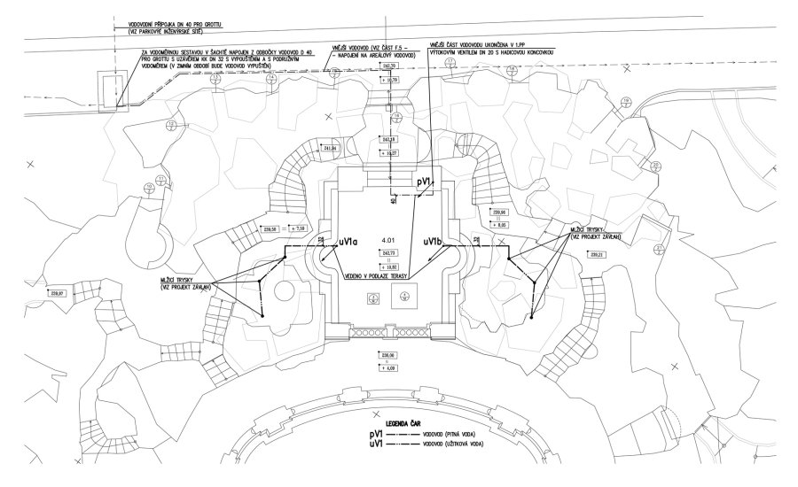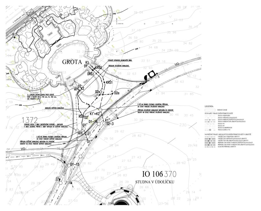 Naše kancelář Růžička a partneři s.r.o. v rámci celkové rekonstrukce grotty (umělé jeskyně) v Havlíčkových sadech zajišťovala ve stupních DSP a DPS projektovou dokumentaci zdravotně-technických instalací (vodovod a kanalizace) v objektu včetně napojení na vnější sítě. Z vodovodní přípojky byl navržen rozvod pitné vody pro potřeby cateringu, k napájení fontánek ve 3.NP a mlžících trysek ve 4.NP a pro doplňování vody v akumulačních jímkách. Dvě akumulační jímky (jedna pro závlahu, druhá pro fontánu) jsou osazeny v rekonstruovaném a upraveném stávajícím podzemním objektu. Vedle jímek byl v tomto objektu vytvořen technologický prostor pro provoz fontány. V jímkách je akumulována prosakující, a trvale přitékající voda z prostoru grotty a odpadní voda z fontánek. Tato užitková voda je z jímek přivedena do technologické místnosti pro závlahy v 1.NP, a kromě potřeb závlahy je využívána také pro doplňování vody v systému fontány. Dešťová a splašková voda z grotty je odváděna dvěma novými přípojkami do stok oddílné areálové (parkové) kanalizace k dalšímu využití (závlahy).