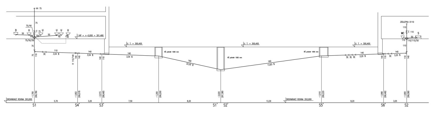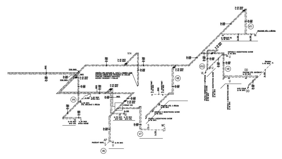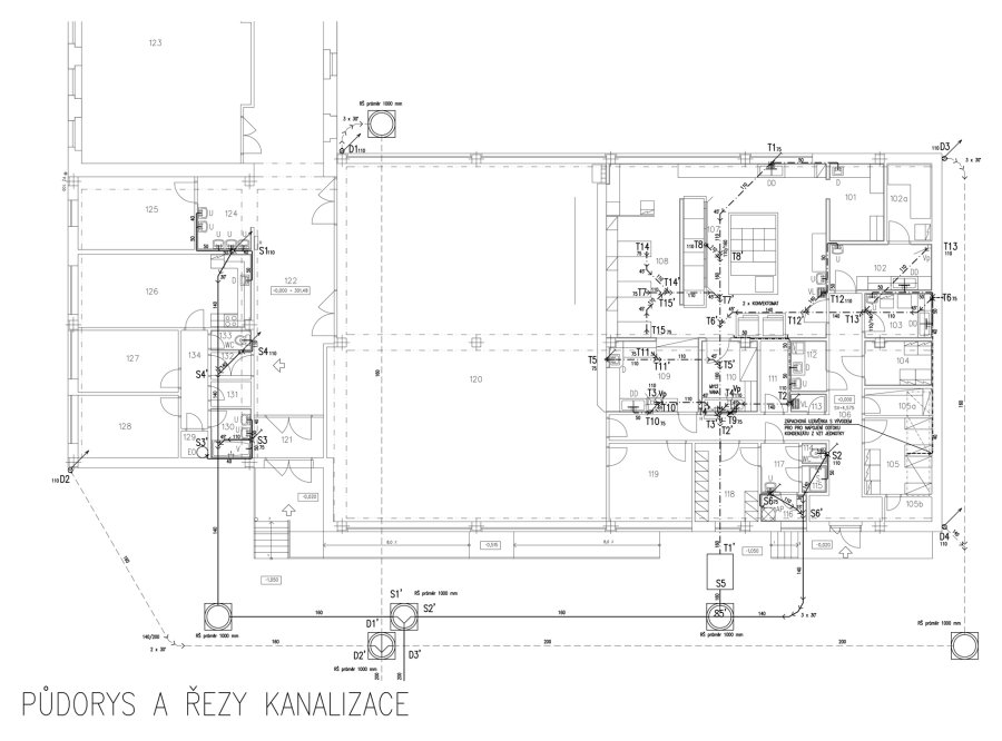 Naše kancelář Růžička a partneři s.r.o. projektovala pro novou kuchyňskou gastro-technologii vnitřní kanalizaci, vodovod a plynovod a zajištovala přípravu stavby a technickou koordinaci. Na svod splaškových vod z bytu školníka a ze sociálního zázemí kuchyně je přes odlučovač tuků a škrobů připojena tuková splašková kanalizace z kuchyně. Splaškové vody jsou odvedeny dvěma hlavními větvemi po pozemku investora do stávající revizní šachty, kde navazuje stávající přípojka veřejné kanalizační sítě. Dešťové vody objektu jsou svedeny do tří hlavních ležatých svodů na pozemku investora, které pokračují do stávající revizní šachty, kde navazuje stávající přípojka veřejné kanalizační sítě.