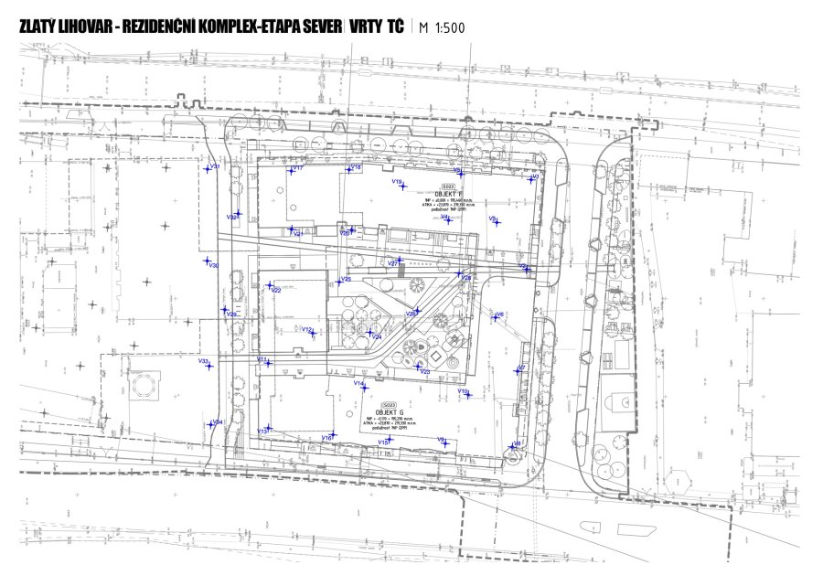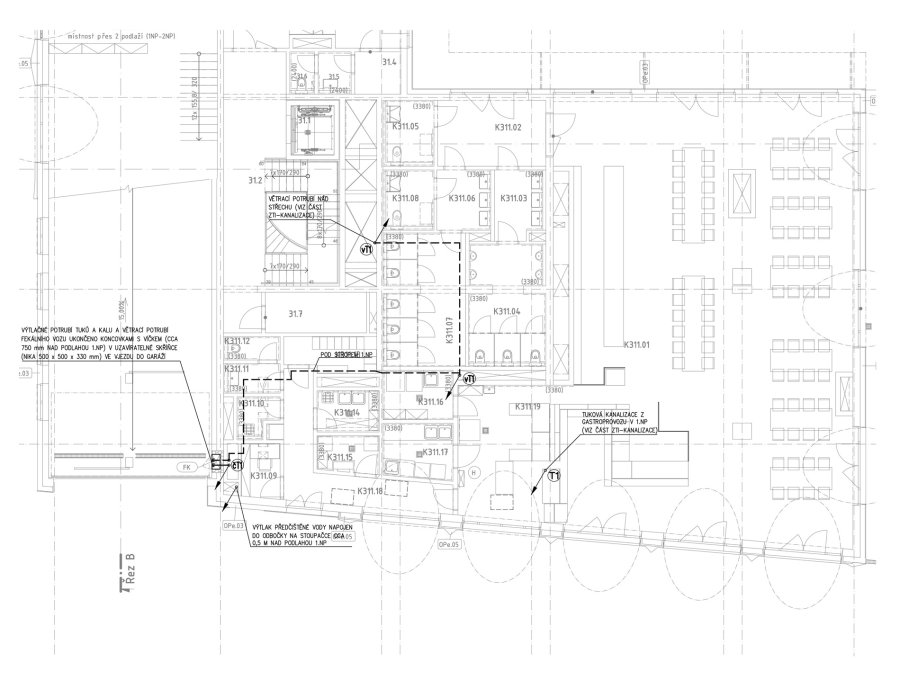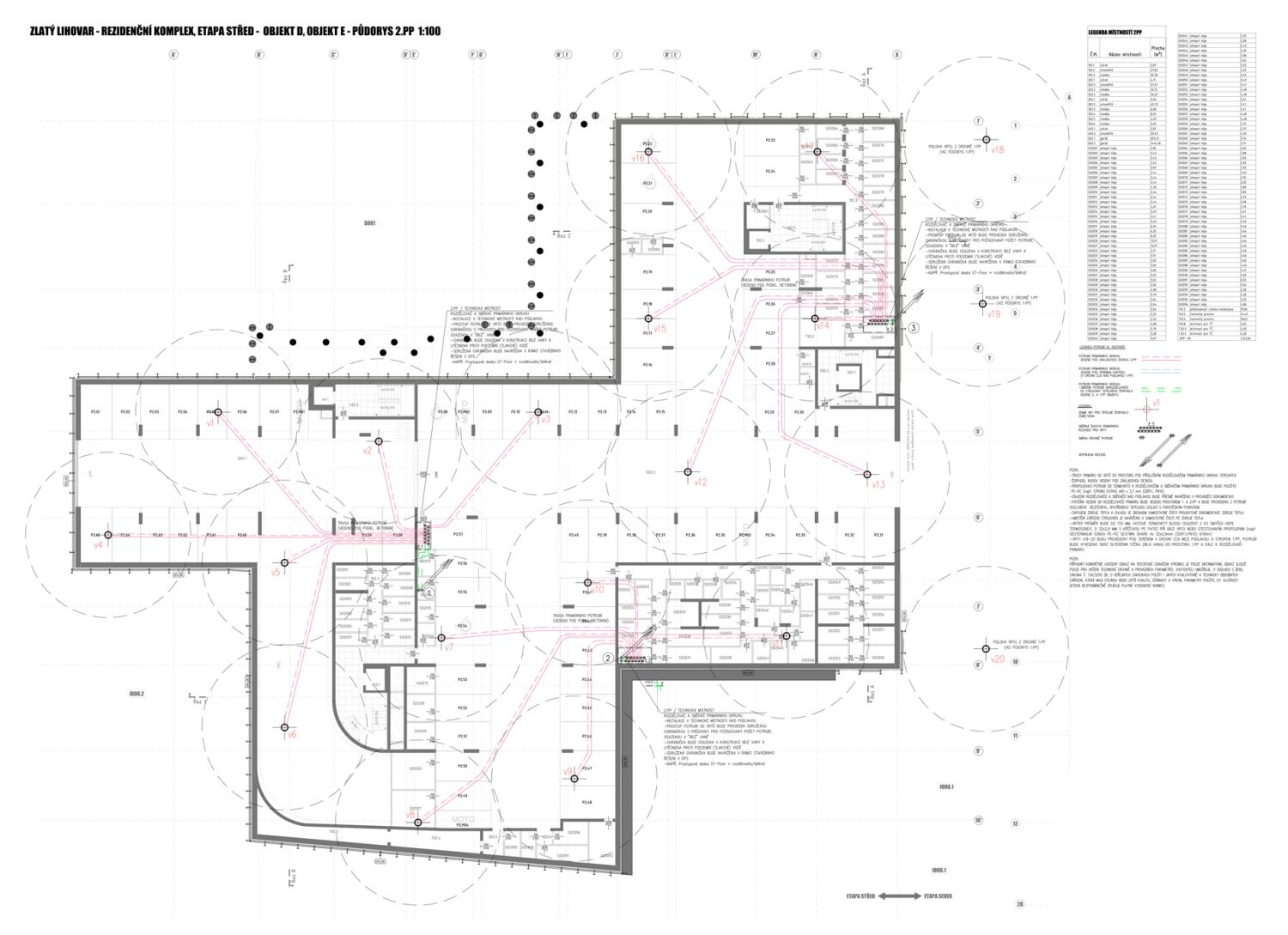 Etapa Střed - přípojky kanalizace a vodovodu, retenční a akumulační nádrže srážkových vod, zdroj tepla a chladu (TČ, vrty), odlučovač tuků (lapol).
